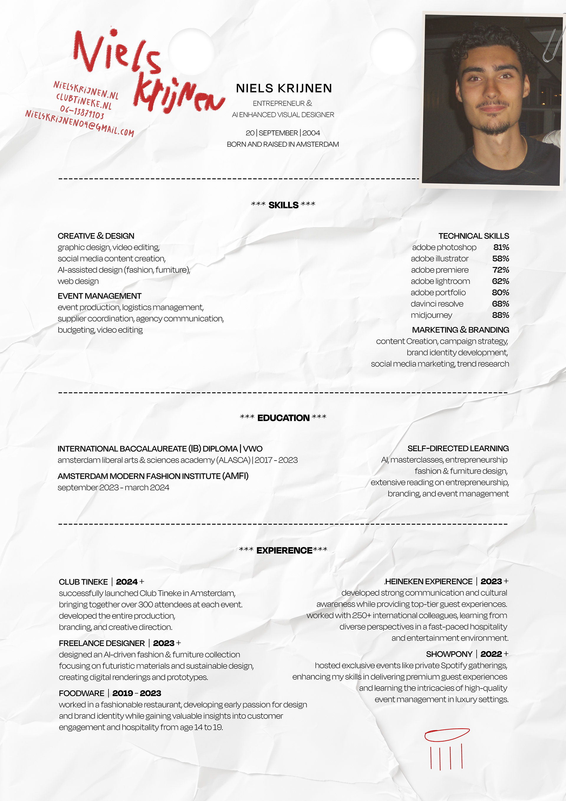 an entrepreneur and creative born and raised in Amsterdam. My journey into design and event production began early, by 14, I was already immersed in the world of fashion and branding while working at a design-driven restaurant. I’ve always had a passion for aesthetics, and that grew into a love for creating experiences that blend art, technology, and culture.